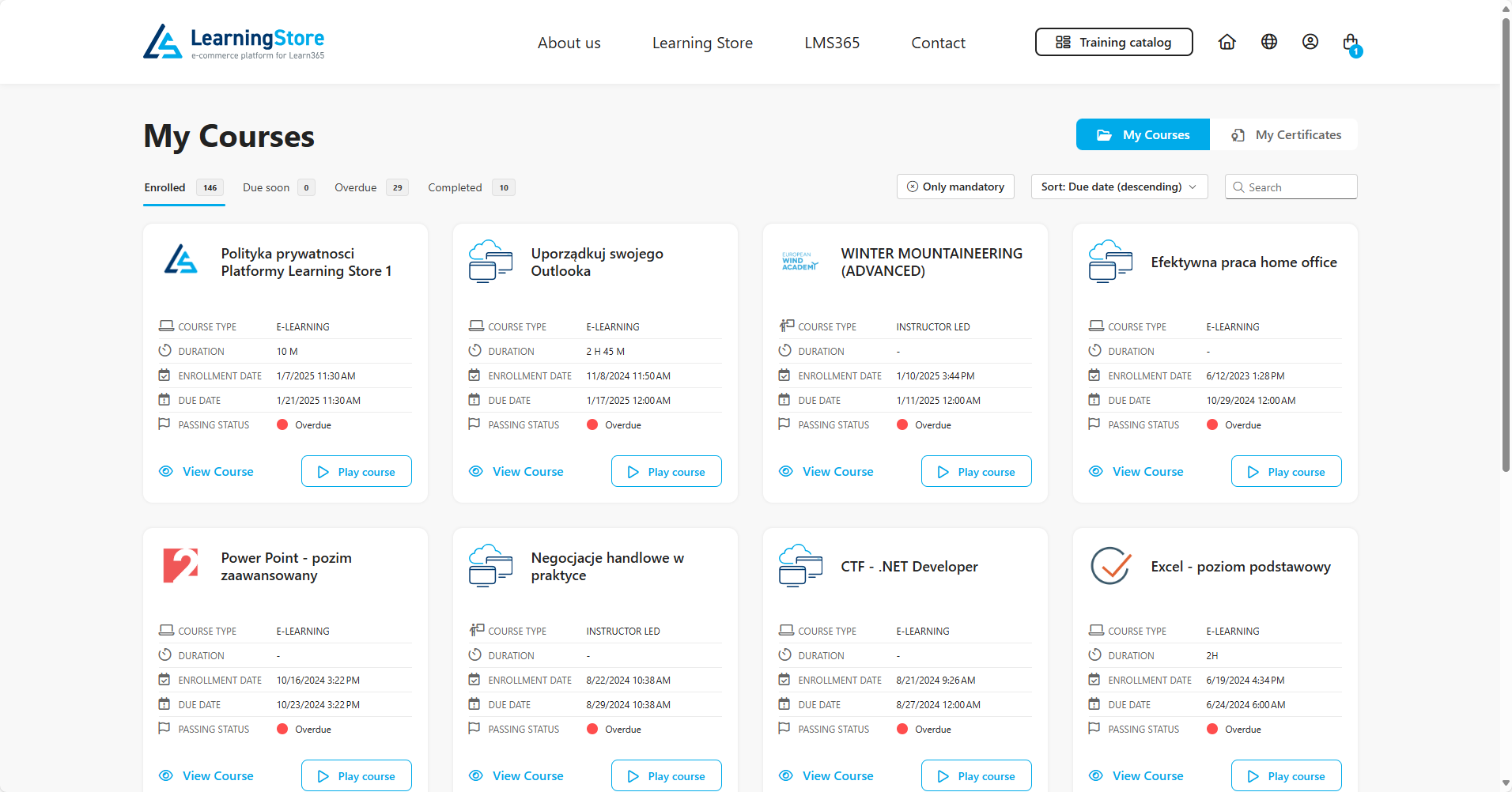 Learning Store to platforma e-commerce, która umożliwia sprzedaż szkoleń online oraz ILT, a także zarządzanie rejestracjami na szkolenia. Dzięki pełnej integracji z Learn365, platforma umożliwia tworzenie dedykowanych katalogów kursów, synchronizację kalendarzy szkoleń oraz wsparcie dla płatności elektronicznych. Learning Store jest idealnym rozwiązaniem dla organizacji, które chcą monetyzować swoje treści edukacyjne i zarządzać szkoleniami w sposób efektywny i przejrzysty.